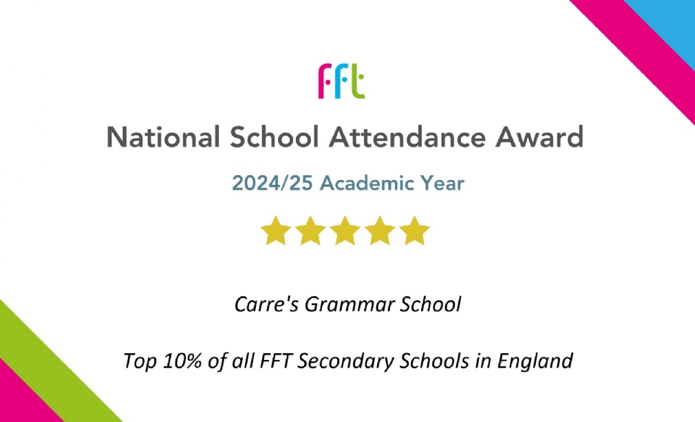 We’re delighted to announce that Carre's Grammar School has been recognised in the top 10% of all FFT schools nationally for attendance during the 2024–25 academic year.